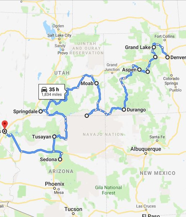 כולל את שמורת הטבע הלאומית הרי הרוקי, את אזור עיירת הסקי המפורסמת אספן וסביבתה, את שמורת הטבע הלאומית הקניון השחור של הגניסון, את 'דרך מיליון הדולר' בהרי סאן חואן, את שמורת הטבע הלאומית מזה ורדה, את 'עמק המונומנט', ואת שמורות הטבע הלאומית ארצ'ס, קניונלנדס, ברייס, זאיון והגרנד קניון וכן את אגם פאוול ואת עיירת האמנים סדונה. המסלול מתחיל בעיר דנבר ומסתיים בעיר וגאס והן מוסיפות לו מעט ניחוח עירוני לפני ואחרי השהות בחיק הטבע (המסלול כולל בתוכו חצי יום בדנבר ויום וחצי בווגאס).