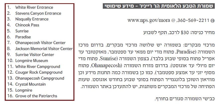 למידע נוסף על שמורת הר רייניר וכן להצעה למסלול טיול במדינת וושינגטון הכולל ביקור בשמורה זו, פנו למסלול הירוק בספר ארה"ב מערב מסלולים:
