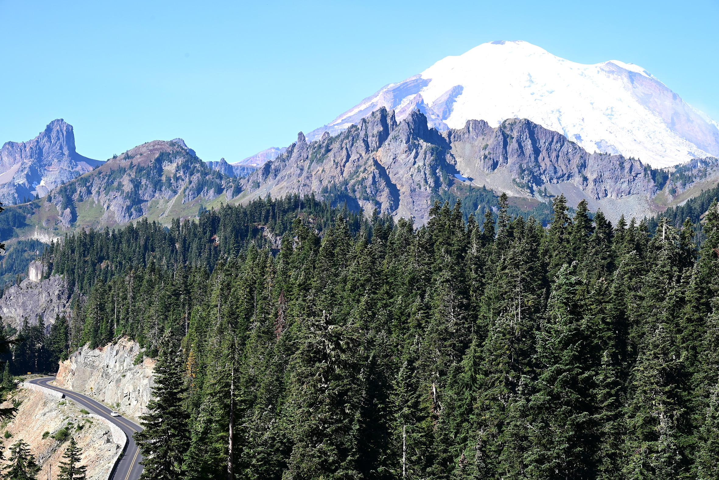 בתמונה – מבט על הר רייניר וכן על הכביש היורד מצ'ינוק פאס (כביש 410 ממזרח, מכיוון יקימה). כבישי השמורה – מכל כיווני הכניסה אליה, מפותלים מאוד ולא מתאימים לבעלי לב חלש