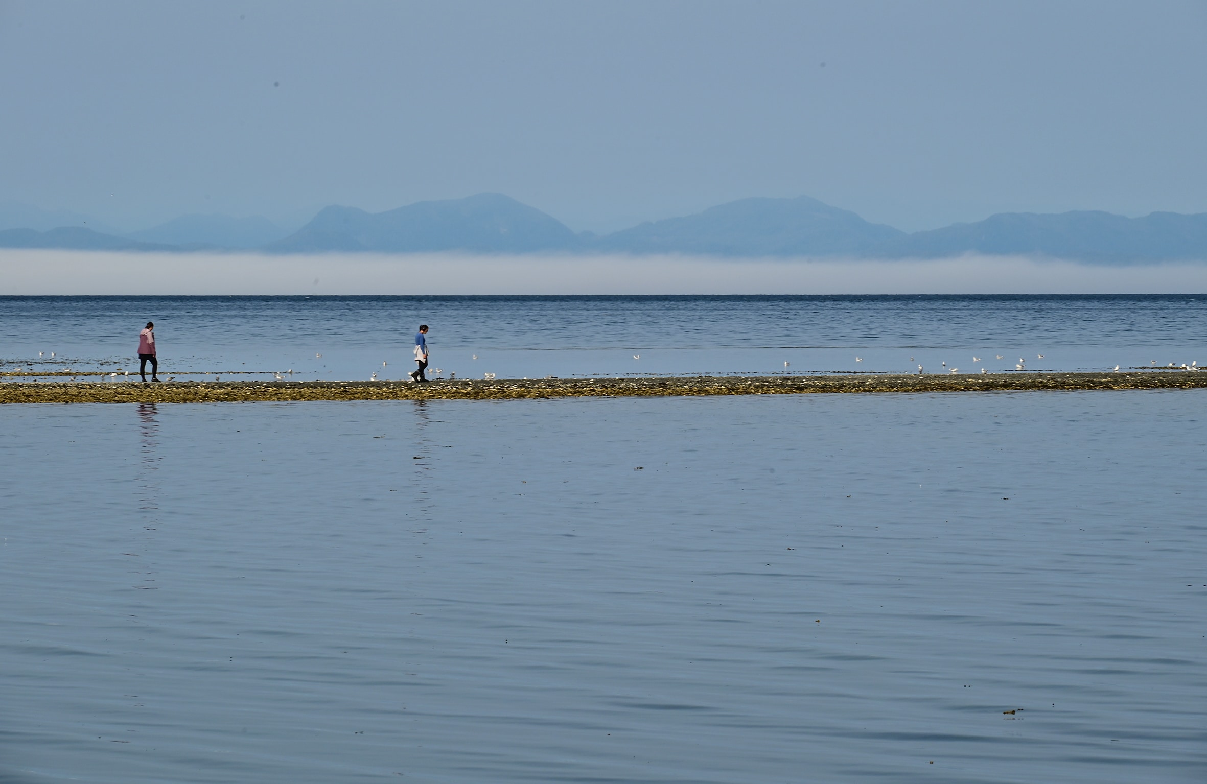 הולכים בשפל על לשון של חול ליד פורט הרדי
