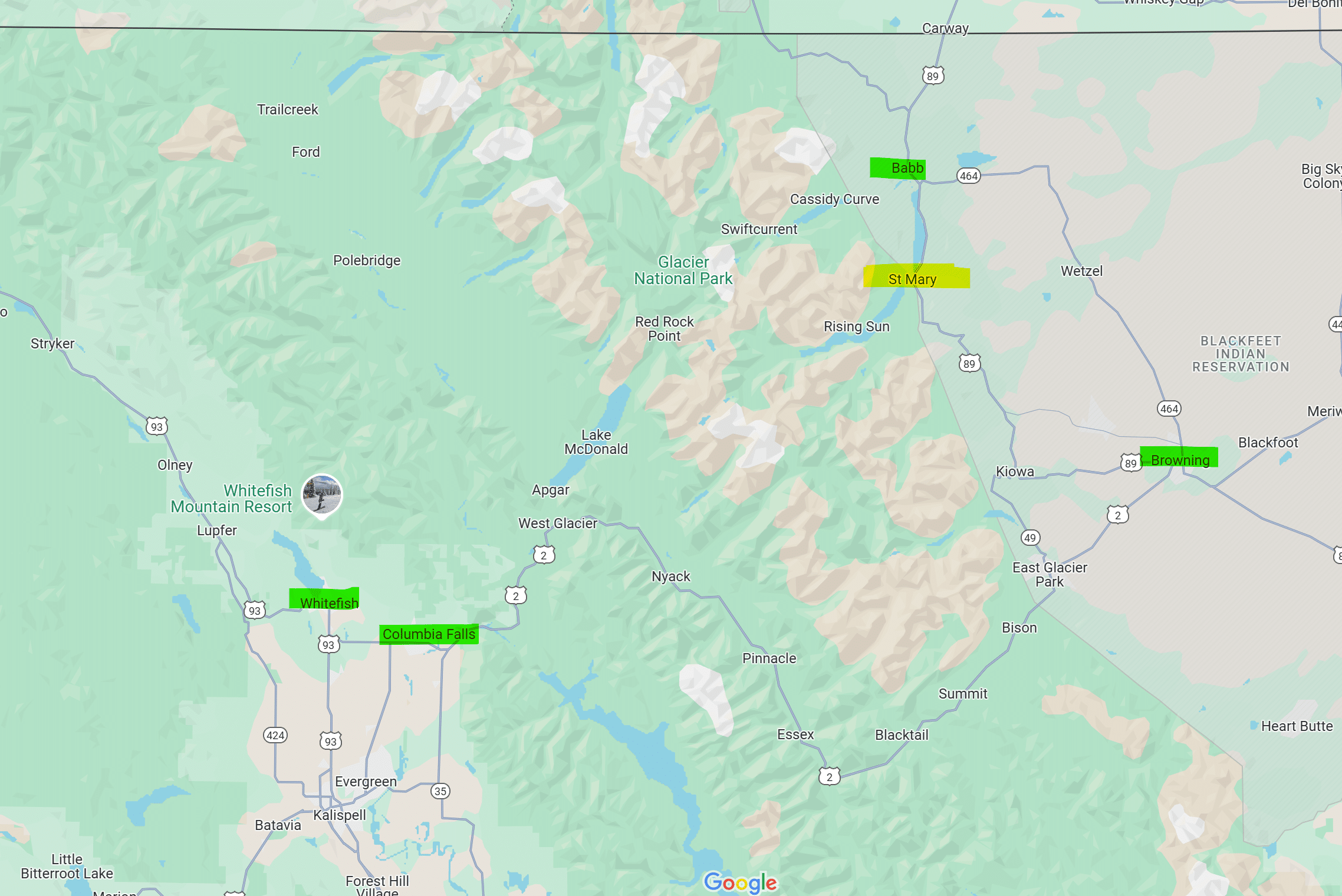 אם לא מוצאים מקום אפשר ללון בעיירה בראונינג (כ-30 דקות נסיעה מסיינט מרי, לכיוון דרום) כאן