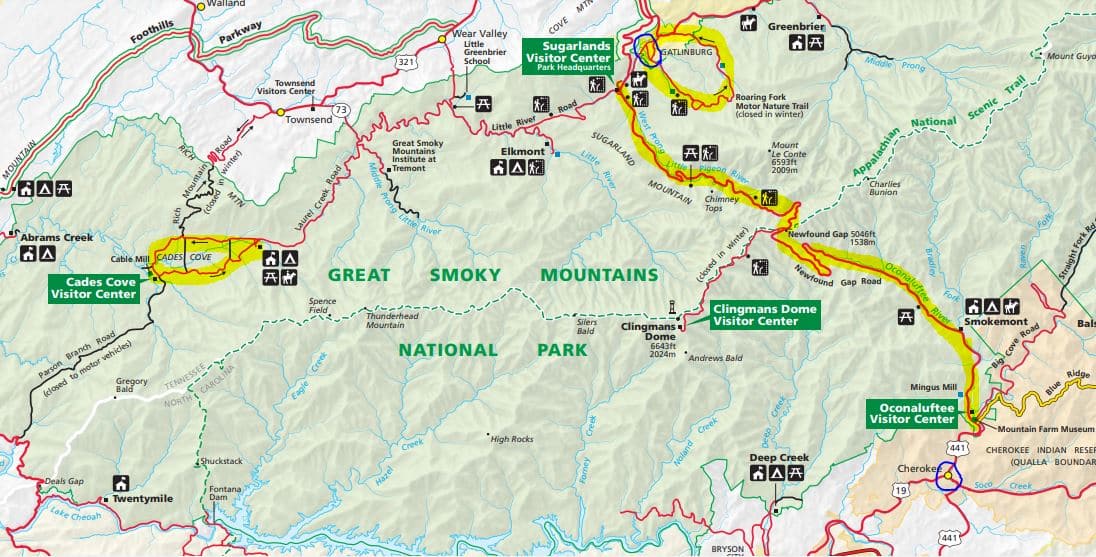 ראו מפה של שמורת הרי הסמוקי. שלושת דרכי הנוף המתוארות לעיל מודגשות בצהוב. העיירות גטלינבורג וצ'ירוקי מסומנות בעיגול כחול: