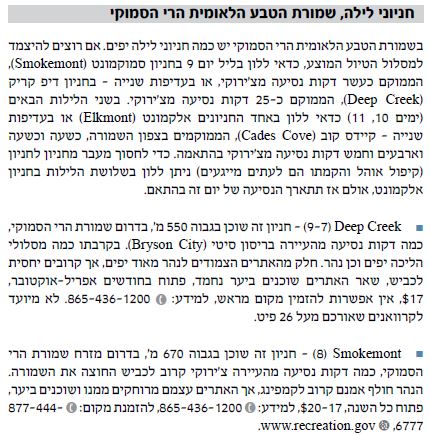 הלנים במלונות יכולים ללון לילה אחד בעיירה צ'ירוקי שבדרום השמורה, ואת שאר הלילות בעיירה הנחמדה (הרבה יותר נחמדה מצ'ירוקי) גטלינבורג שבצפון השמורה. מי שלן בחניוני לילה יכול ליהנות מהעבודה שחניוני השמורה הם ברובם יפים במיוחד. ראו להלן תצלום מסך מהספר ארה"ב מזרח מסלולים בו מידע על חלק מחניוני השמורה: