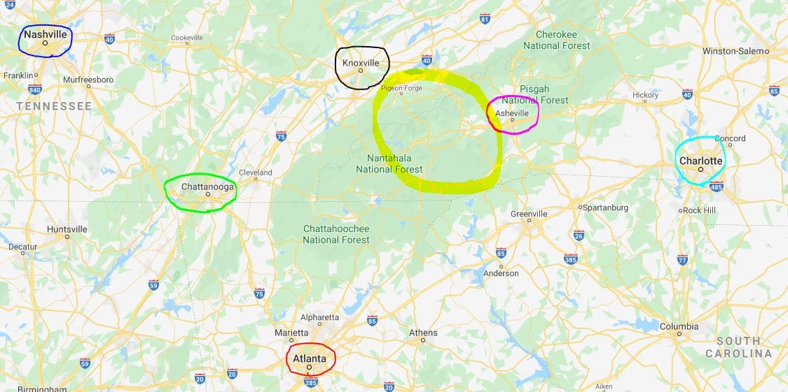 העיר הגדולה הקרובה ביותר להרי הסמוקי שבה יש שדה תעופה בינלאומי היא אטלנטה (Atlanta, מסומנת בעיגול אדום במפה) – והיא ממוקמת כשלוש שעות נסיעה מדרום השמורה. גם בעיר נאשוויל (Nashville, מסומנת בעיגול כחול במפה) יש שדה תעופה בינלאומי. עיירות אחרות (שגם בהן יש שדות תעופה אך קטנים יותר) השוכונת לא רחוק באופן יחסי מהשמורה הן נוקסוויל (Knoxvilla, מסומנת בעיגולשחור במפה), אשוויל (Ashville, מסומנת בעיגול ורוד במפה), שרלוט (Charlotte, מסומנת בעיגול טורקיז במפה) וצ'טנוגה (Chattanooga, מסומנת בעיגול ירוק במפה). שמורת הרי הסמוקי עצמה מסומנת בצהוב: