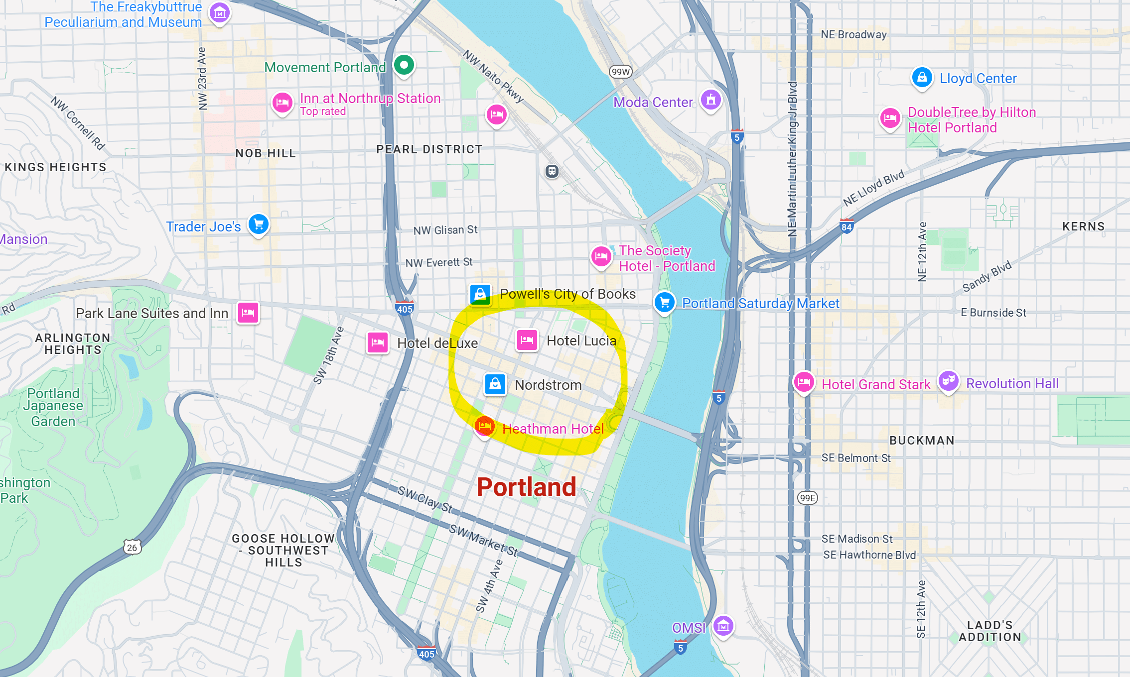 ראו מיקום מרכז העיר פורטלנד מסומן בצהוב במפה: