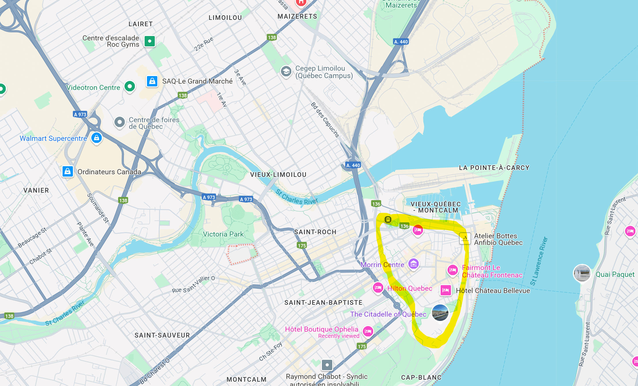 אזור העיר העתיקה של קוויבק סיטי (המוקף חומה) מסומן בצהוב. העיר העתיקה וסביבתה היא האזור שהכי נחמד ללון בו אם רוצים לטייל מהמלון ברגל אל אתרי העיר השונים. מצד שני מרחקי הנסיעה לא ארוכים ואפשר למצוא חניה בתשלום נוחה, כך שאם אתם רוצים לחסוך וללון באזורים מרוחקים יותר זו גם אפשרות סבירה: