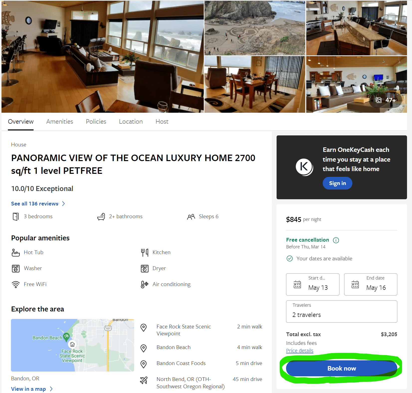 - אבל רגע. עוד לא סיימנו. בחלק מהיחידות אירוח ההזמנה היא מיידית ובחלק יש להגיש בקשה – לעתים היא תאושר ולעתים לא. ראו להלן שני בתים לדוגמא להשכריה בעיירה בנדון (Bandon) שלחופי מדינת אורגון (בעיירה זו היצע המלונות הוא דל יחסית ומנגד יש לחופי העיירה בתי נופש נהדרים). עשיתי חיפוש אחר בתים בעיירה זו (ראו כאן את תוצאות החיפוש) ומצאתי שני בתים שמצאו חן בעיני. שניהם מדורגים גבוה ושניהם ממוקמים בקו ראשון לים. בבית אחד ההזמנה היא מיידית (עיגול ירוק) ובבית אחד יש להגיש בקשה להזמנה (עיגול צהוב).