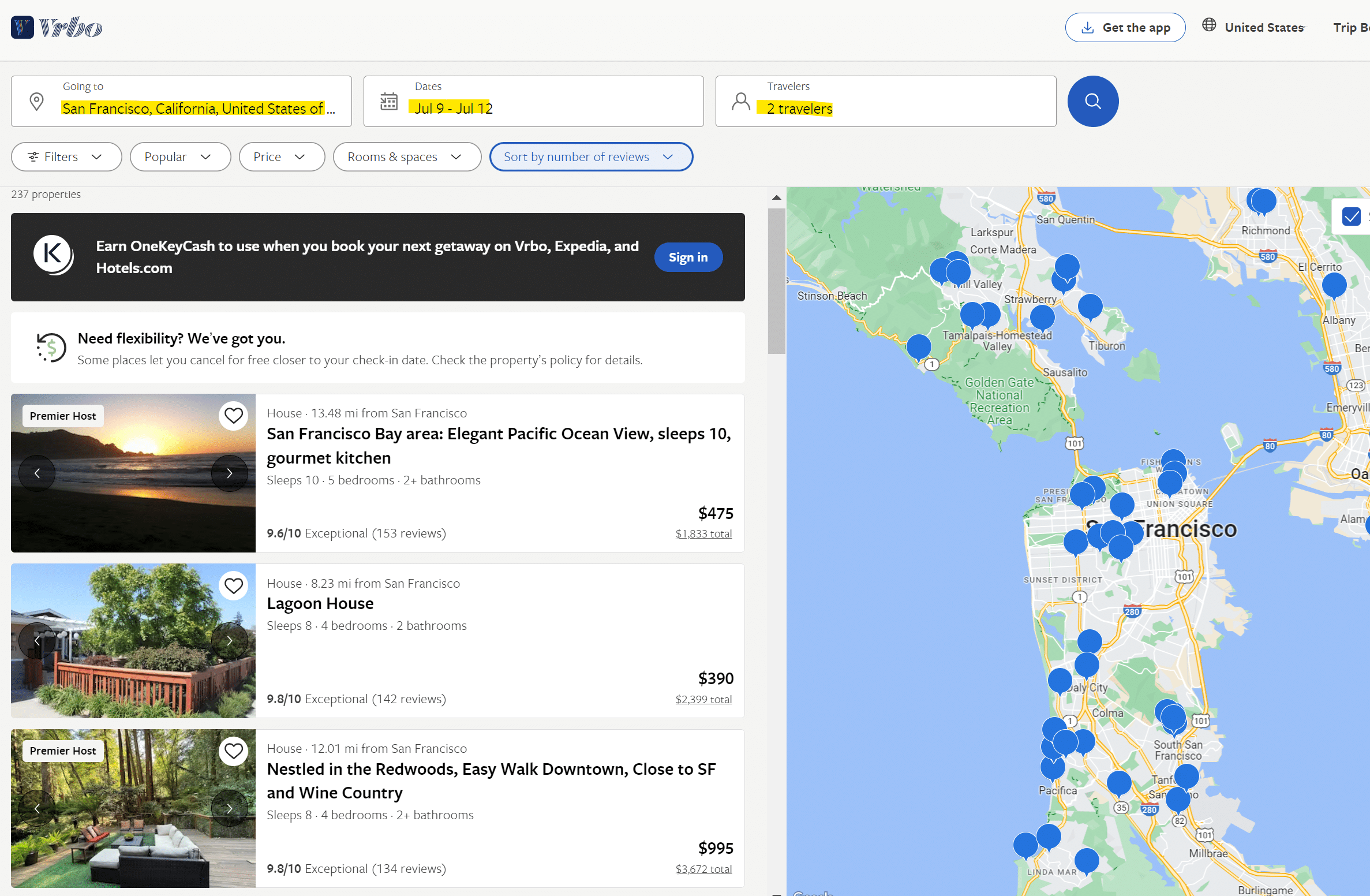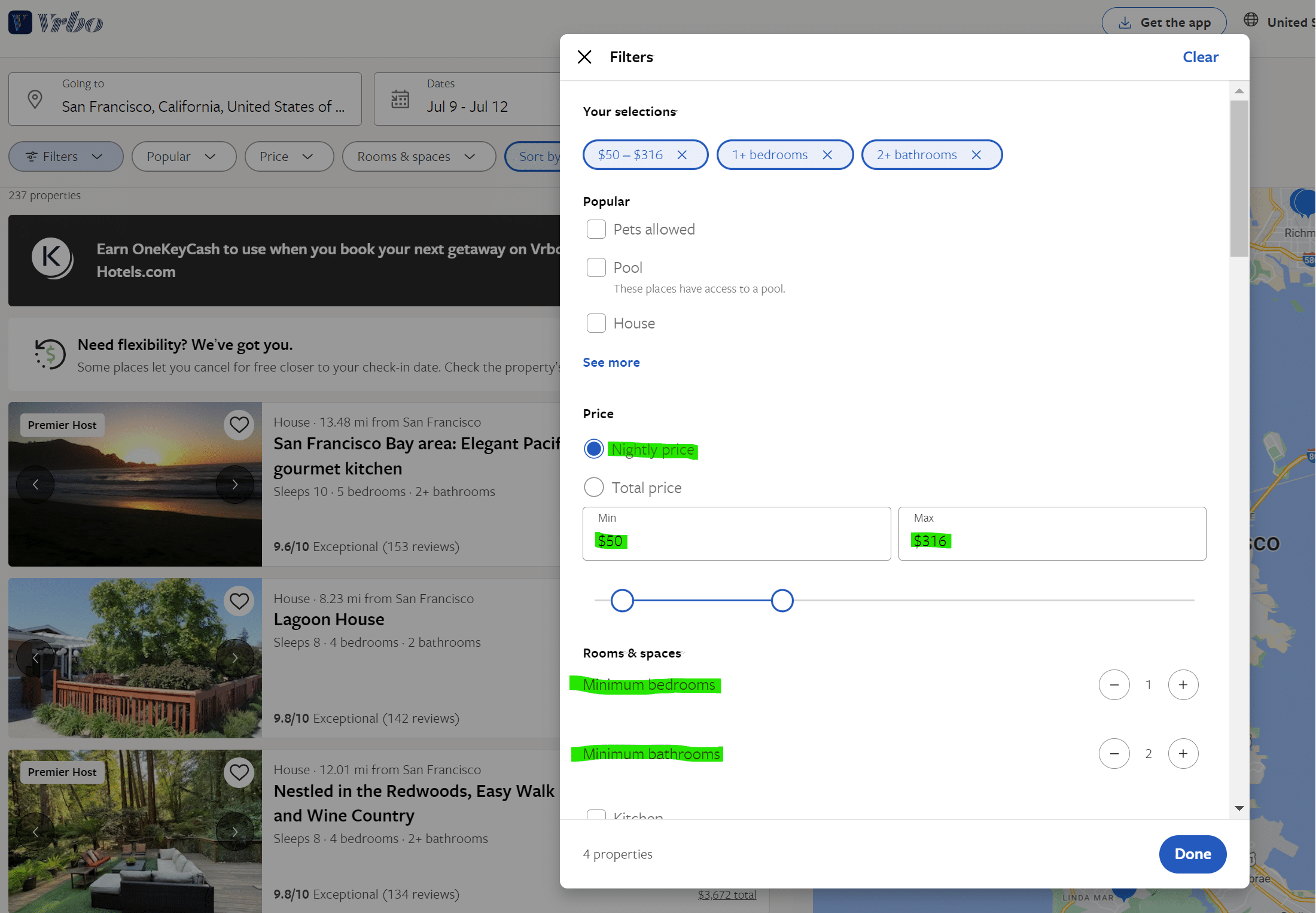 - כדי להתחיל בחיפוש יש להזין את שם העיר או העיירה, תאריכים, מספר אנשים – ראו הדגשה בצהוב (במקרה הזה של דירות בסן פרנסיסקו, עיר שיש בה היצע מוגבל של חדרי מלון המתאימים למשפחות גדולות, ולכן לינה בדירה בתחומה היא אפשרות מומלצת בהחלט), וכן אפשר להזין בפילטור טווח מחירים (ליום או לכל השהות), מספר חדרים/חדרי אמבטיה ועוד – ראו הדגשה בירוק.