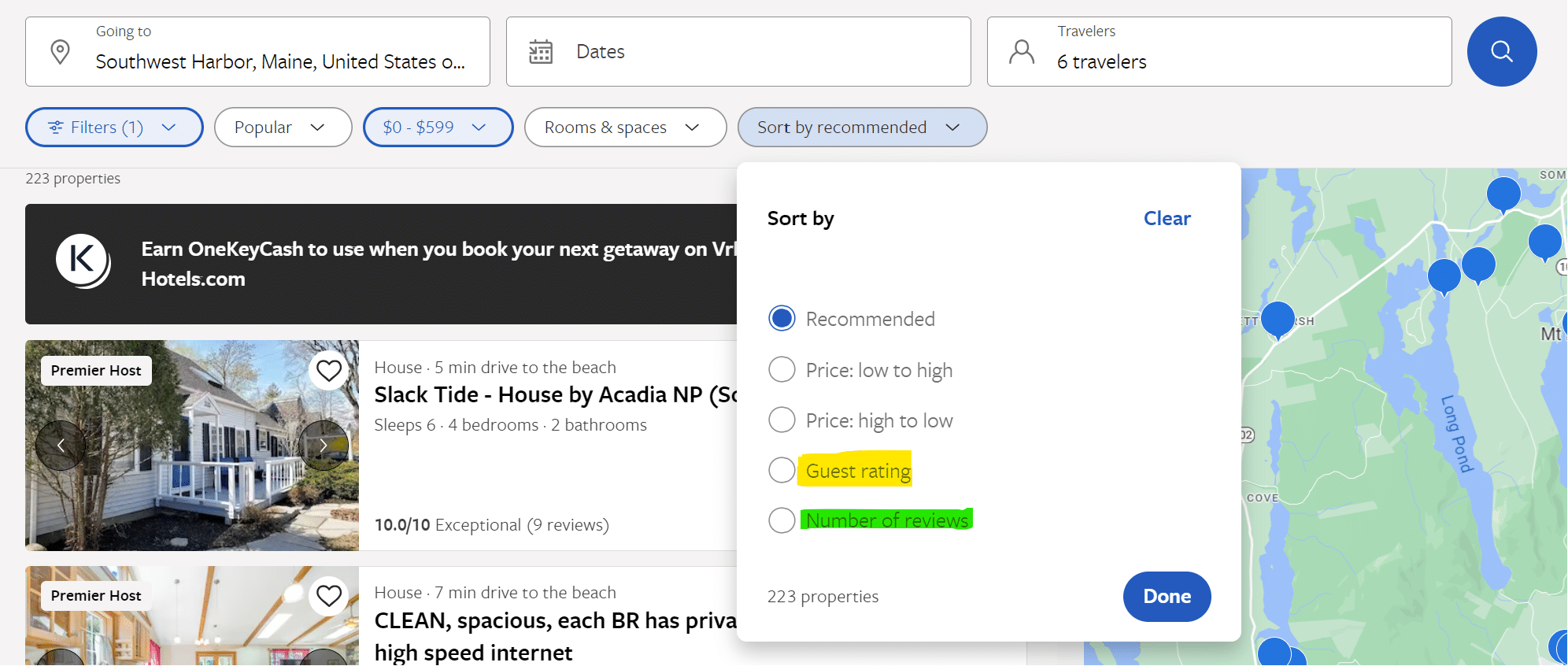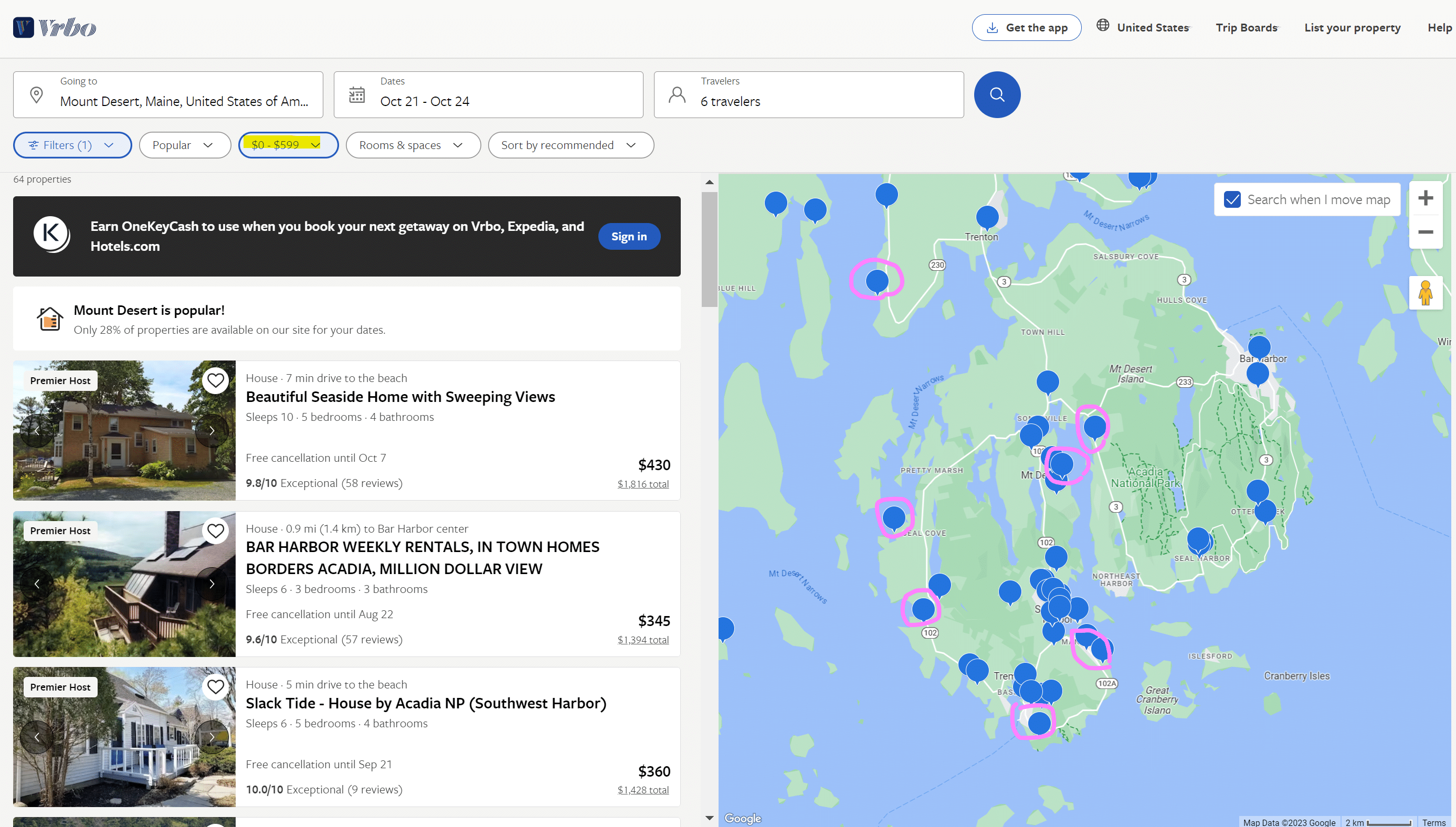 - בשלב הזה תקבלו רשימה של כל יחידות האירוח המוצעות, וכאן מתחילה למעשה ההתברברות של רוב המטיילים. איך בוחרים? בדרך כלל יש הרבה אפשרויות (אלא אם אתם מזמינים ברגע האחרון ואז ההיצע יהיה נמוך), ומאוד קשה לבחור. אני מעדיפה לא להזין את סינון סדר הצגת התוצאות (מחיר גבוה לנמוך, ביקורות וכדומה), ומציעה דבר ראשון לראות היכן הנכס ממוקם. למשל במקרה הזה חיפשתי בית בסביבות שמורת הטבע הלאומית אקדיה (באי מאונט דזרט), היה חשוב לי למצוא בית קרוב לים. הזנתי את תאריכי השהות, את מספר האנשים, את התקציב ללילה (עד 600 דולר) ועשיתי זום אין במפה, כל הבתים שמסומנים בוורוד נראו לי קרובים מאוד לקו המים (אפשר אגב גם להזין בפילטור Beachfront או Oceanfront, אבל מנסיון – זה לא תמיד עובד):