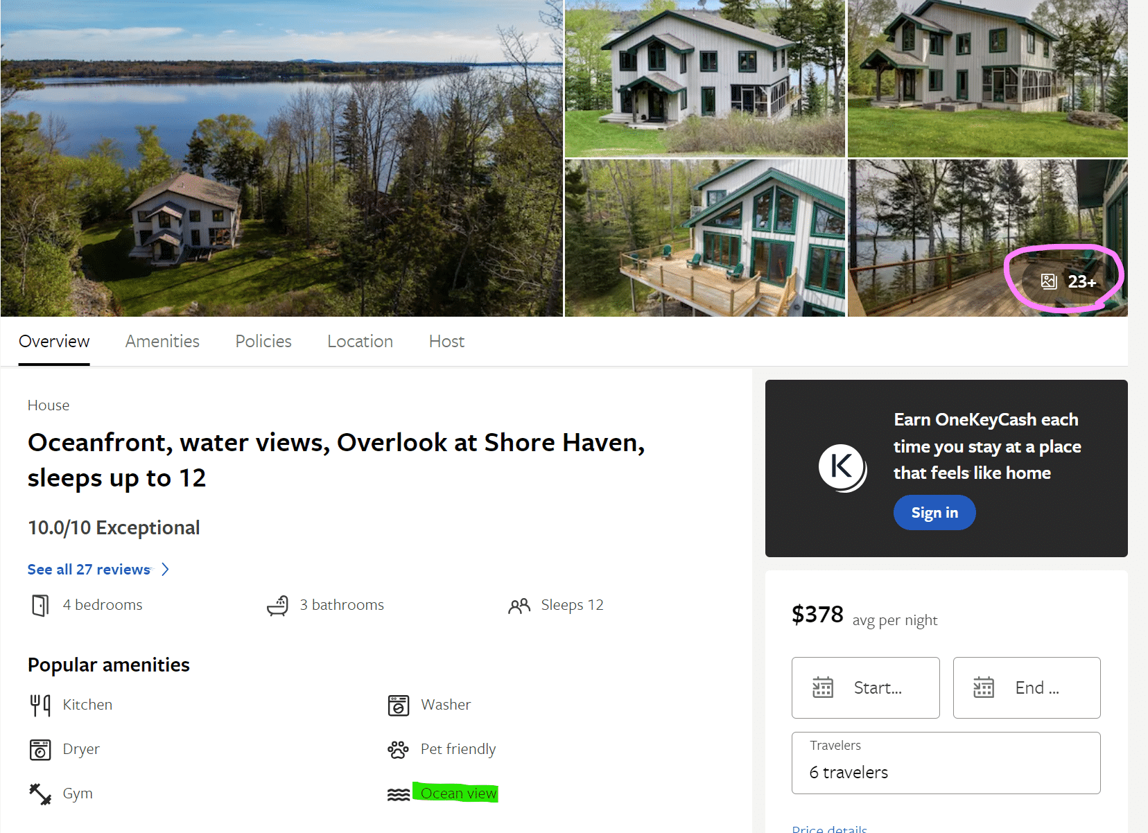 אז ממשיכים לחפש… נכנס נוסף – הבית הזה. מדורג 10/10, 27 ביקורות (בדרך כלל מעדיפה ללכת על מעל 50 ביקורות אבל גם 27 עם כזה ציון גבוה זה לא רע). והכי חשוב – יש תצלום של הבית מבחוץ (מצד שמאל למטה) שמראה את הקרבה שלו לקו המים (שבמקרה הזה היה לי חשוב). גם התמונות של פנים הבית יפות (כדי לראותן לוחצים על העיגול הוורוד). בקיצור בהחלט בית שאפשר לסגור עליו ולהזמין.