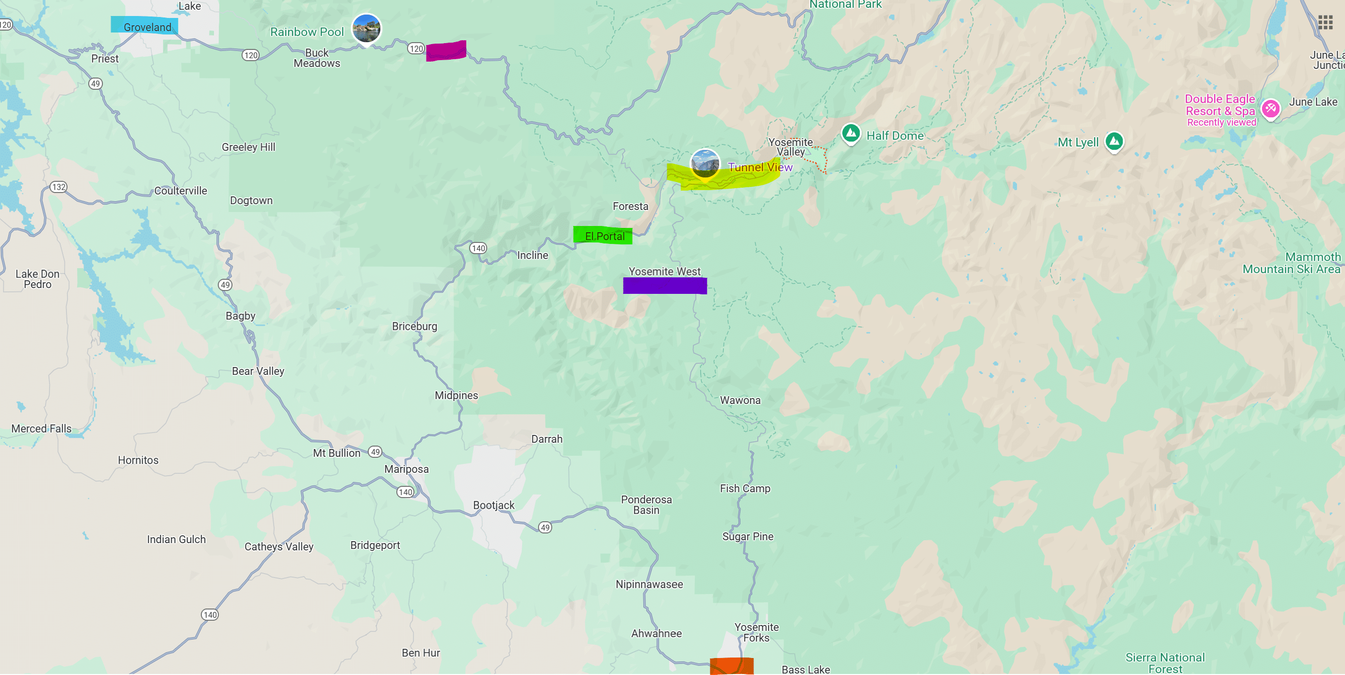 ראו מיקום נקודת היישוב אל פורטל (בירוק), אזורי המלונות בכביש 120 (בוורוד), עמק יוסמיטי (בצהוב), גרובלנד (בתכלת), אוקהרסט (בכתום), יוסמיטי ווסט (בסגול):