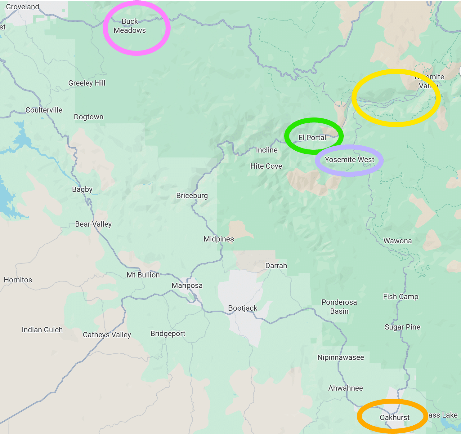 ראו מיקום נקודת היישוב אל פורטל (בירוק), אזורי המלונות בכביש 120 (בוורוד), עמק יוסמיטי (בצהוב), גרובלנד (בתכלת), אוקהרסט (בכתום), יוסמיטי ווסט (בסגול):