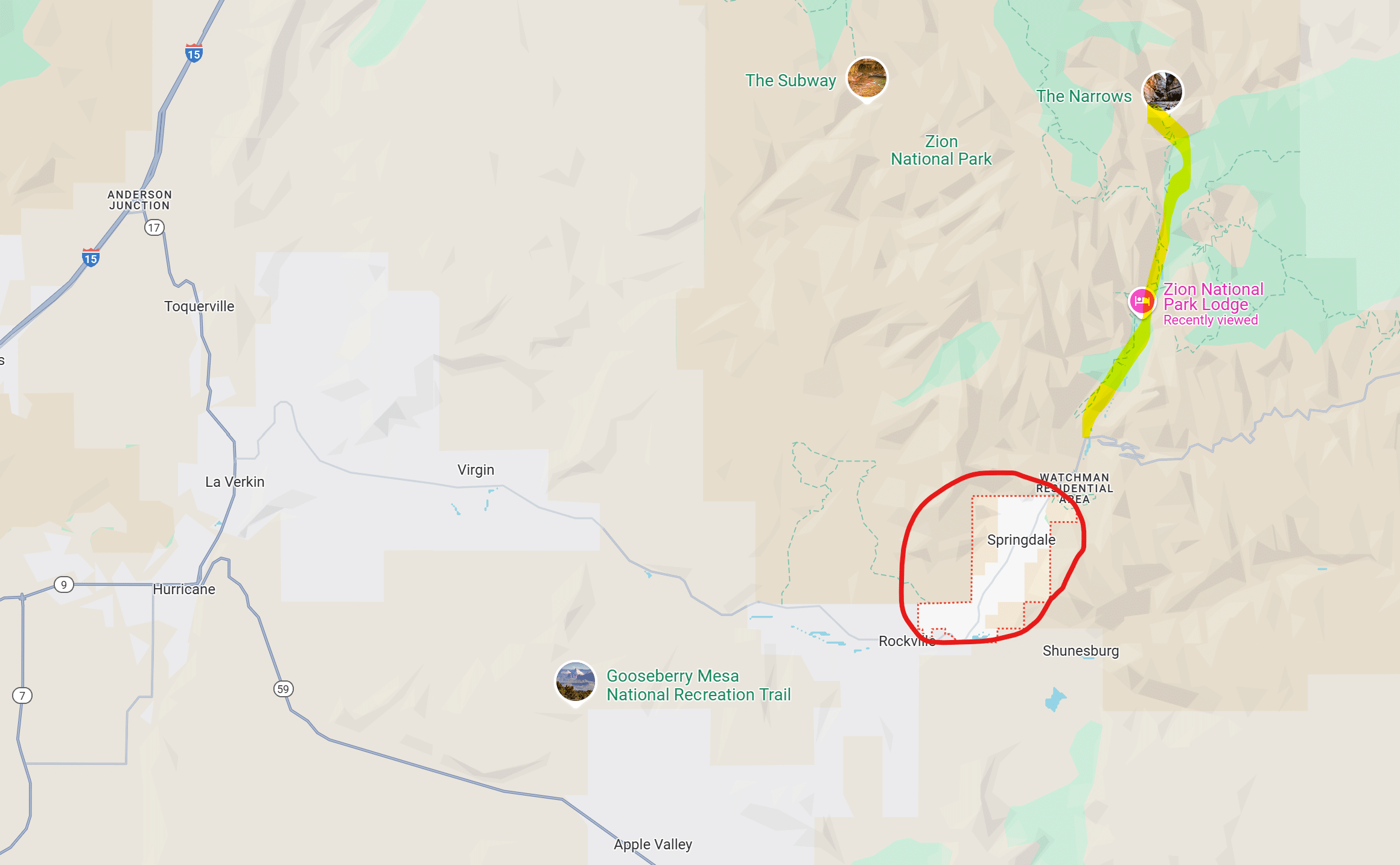 המלונות המתוארים להלן שוכנים בעיירה ספרינגדייל הסמוכה לשמורת זאיון. אפשר גם ללון בשמורת זאיון עצמה בלודג' השוכן בתוך קניון השמורה (מסומן בוורוד במפה, אם תלונו בו תוכלו לנסוע בקניון השמורה, עד למלון, ברכבכם הפרטי – הנסיעה בכביש למי שאינו לן במלון זה היא בשאטל. יש לציין שכדי לתפוס מקום במלון זה יש להזמין מבעוד מועד), ראו מפה ובה מיקום העיירה ספרינגדייל (מסומנת בעיגול אדום) ומיקום הקניון של זאיון (מסומן בצהוב):